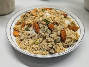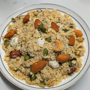 Virsa delights Premium homemade Semolina Panjeeri made with Premium desi ghee and Protein rich base with 20+ natural healthy ingredients in hygenic environment. Panjeeri is one of the famous delights of Pakistan. Our homemade Panjeeri is full of energy and a highly nutritious snack. It is prepared in 100% Pure Homemade Desi Ghee and loaded with premium-quality dry fruits.